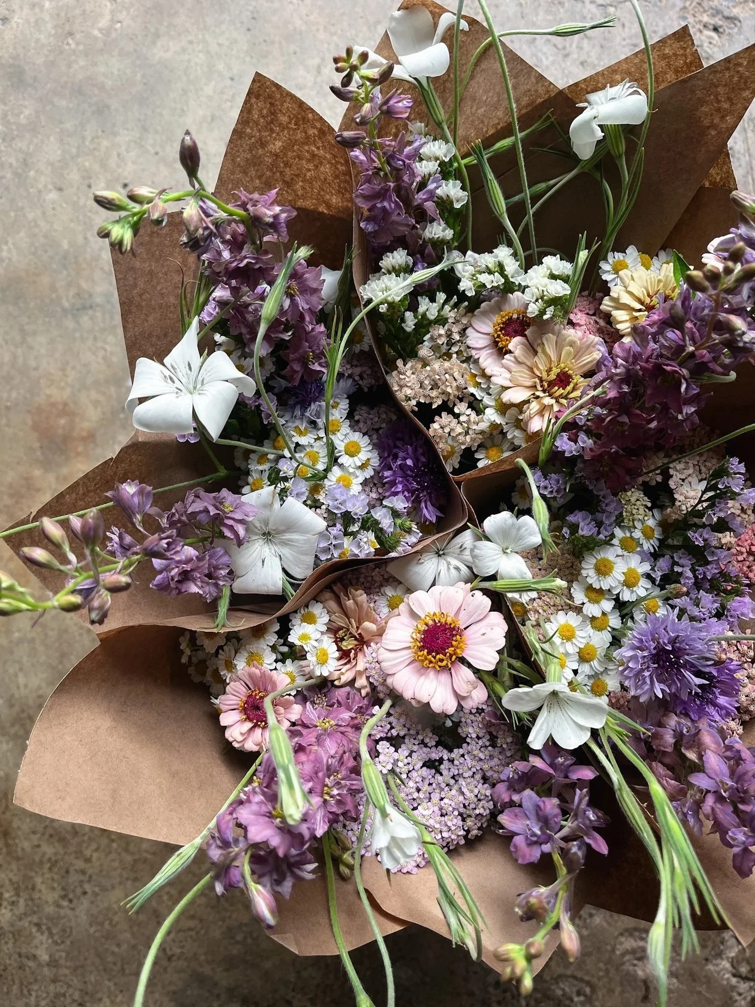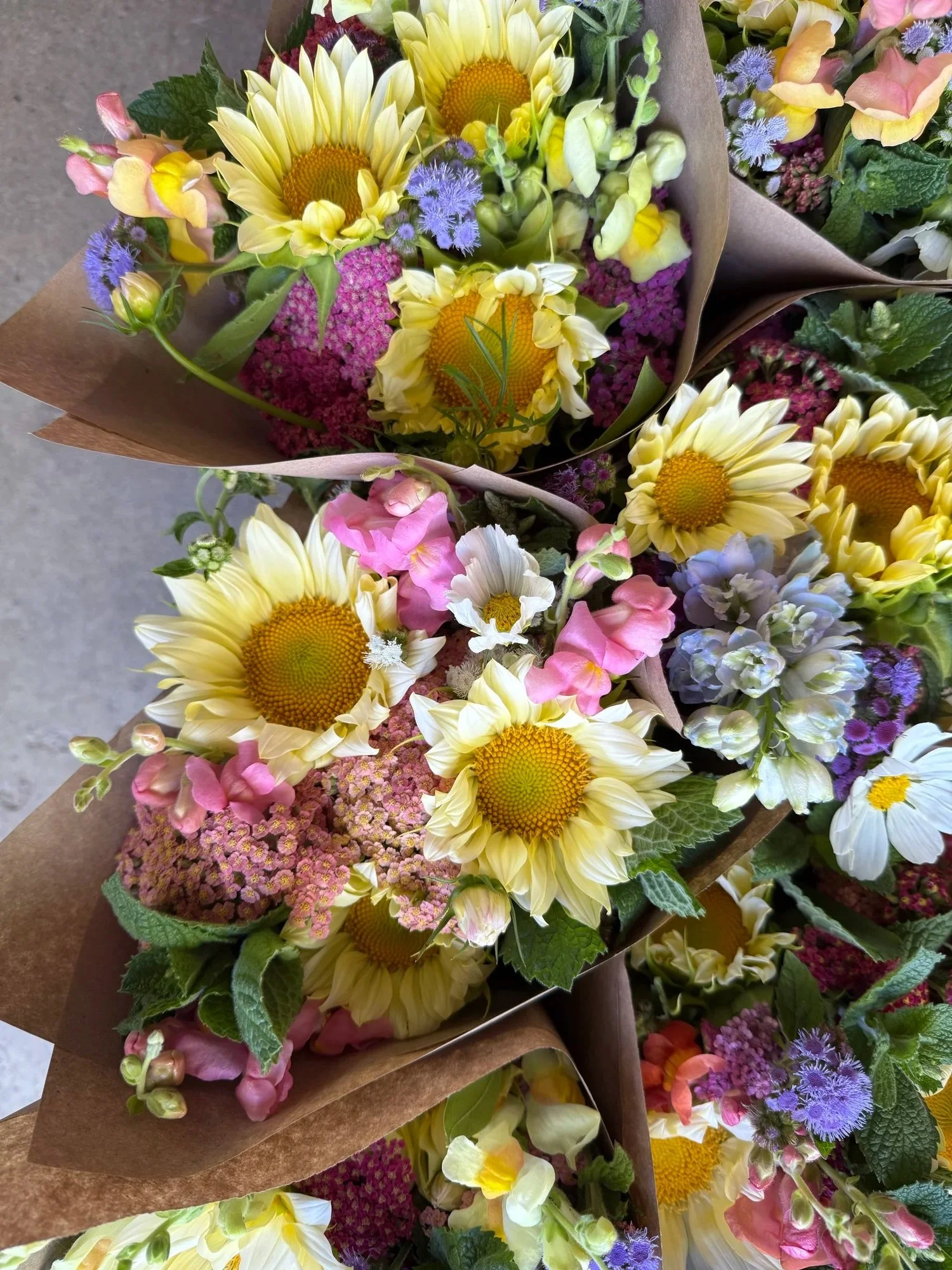 Our delivered bouquets are designed in our signature garden style- airy, textural, and full of the season’s very best blooms. Each one is thoughtfully arranged to feel natural, romantic, and a little wild 🌾